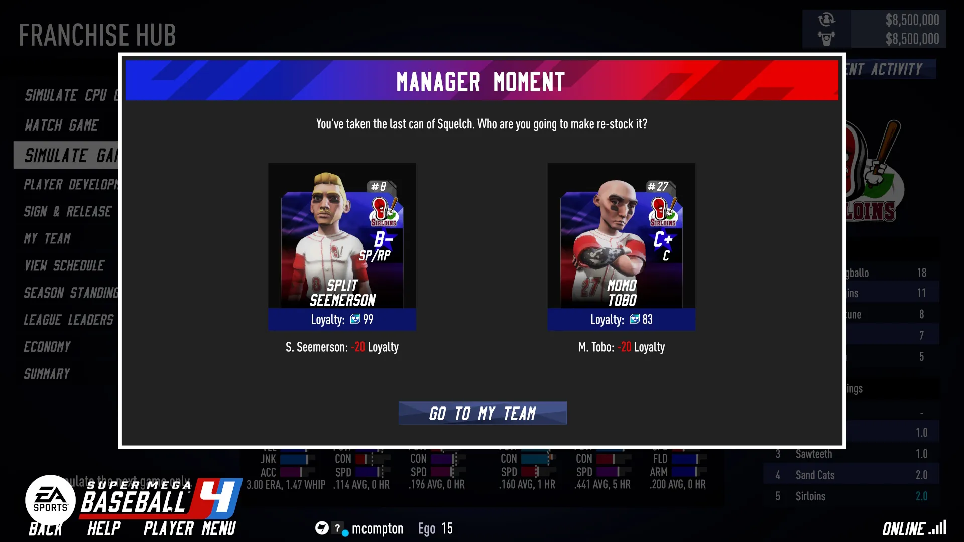 While in Franchise mode, you’re presented with managerial decisions after each game. These range from which player gets the last pair of socks to who to blame for a bad loss. Though they sometimes become tedious, these decisions affect player loyalty, which comes into play in the offseason when it’s time to re-sign them. Free agency plays a big role, as contracts only last one year, and I appreciate the ability to make simple one-to-one decisions on a position basis each offseason. However, I’m disappointed by the lack of trading available. Even in older baseball video games, trading is one of my favorite activities to do in long-form modes, so its absence is a letdown.