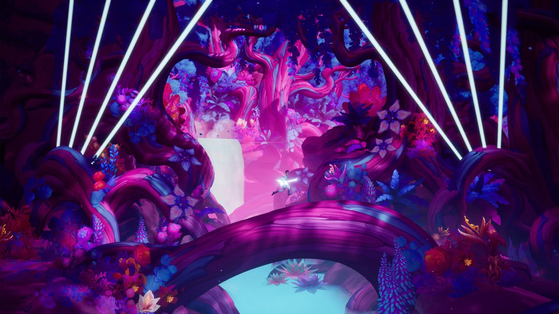 During your travels, you can hit a button to play your guitar, and typical platforming actions trigger fun, rock star-like animations. For instance, a simple long jump transforms into a truly epic guitar solo. The slide button causes the protagonist to slide dramatically across the ground on his knees. These actions don’t have much of an impact on the gameplay, but if you combine these flourishes with how the unbelievably beautiful world reacts to your energizing notes with bursts of color and movement, then The Artful Escape more than makes up for its shallow platforming.