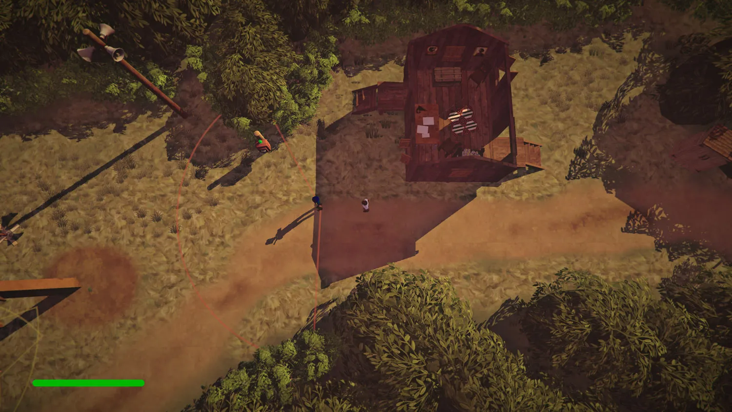 From a gameplay perspective, The Church in the Darkness offers a simplified, top-down version of the stealth-infiltration action series like Hitman have been serving up for years. Countless guards patrol Freedom Town, requiring you to skirt their vision cones (visible on the easier difficulty levels), dispense lethal or non-lethal takedowns from behind, or toss stones to lure them out of the way. These well-trodden mechanics (along with the ill-advised guns-blazing approach) make up the totality of the core gameplay. While you unlock new weapon types and can find items like alarm clocks to use as distractions, they are superfluous and less efficient than sticking to the basics. Only disguises, which shrink enemy vision cones, are worth going out of your way to search for in the various cabins and buildings littered throughout the map. Simply put, the gameplay gets dull far too quickly for the amount of replays The Church in the Darkness encourages.