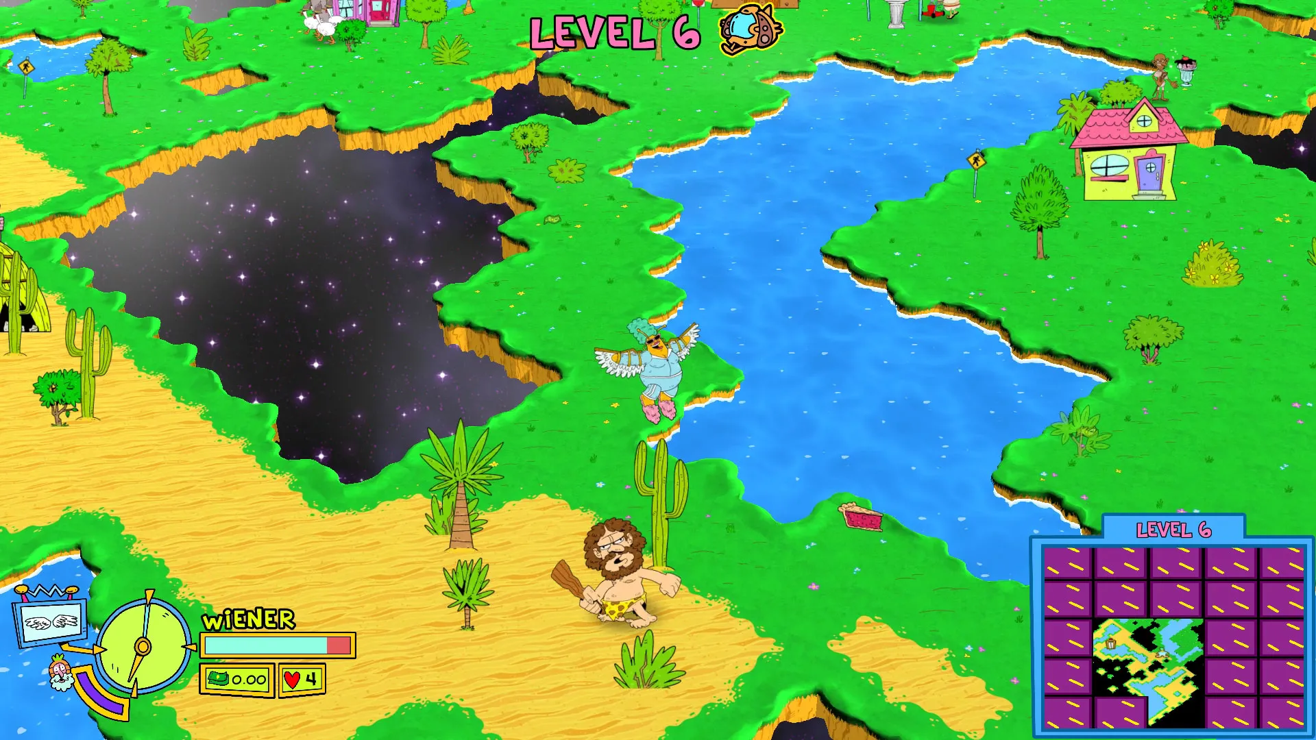 Back in the Groove is essentially a remake of the Genesis original. If you aren’t familiar with that one, the concept is simple: Your spaceship has crashed on Earth, and you need to track down its 10 pieces so you can return to your home planet, Funkotron. As with the original, Back in the Groove trades the subterranean cave systems and confusing dungeon layouts you typically find in roguelikes for an outdoor setting. When you open your map, the sprawling mazes of nodes and paths may seem familiar, but with a notable difference from ordinary fantasy-themed roguelikes: ToeJam & Earl’s interpretation of Earth is one of floating land masses stacked atop one another. Stumble off the edge of a landmass or a narrow trail, and you fall down to the previous level.