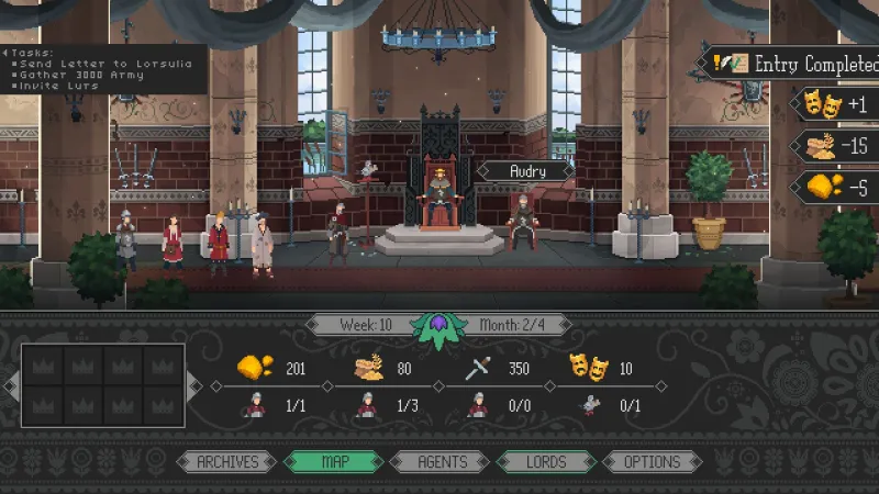 Yes, Your Grace is straightforward on the surface, and only takes a few hours to complete a single run. Every week, people come to your kingdom with requests for money, resources, or assistance from your higher-ups. The game is all about resource management; you only have so much to go around, so you can’t say yes to everyone. Once you run out of cash or supplies, it’s game over. However, you can’t curry favor and reap its rewards without giving a little. You may use precious resources to forge an alliance to gain access to another kingdom’s army or spend money upfront to fund an inn that provides a weekly cut of its earnings later. Whatever you do, your decisions grow more dire as turmoil escalates and you prepare for a seemingly against-all-odds war. This is an engaging loop for the most part, but it gets repetitive because the routine never gets much of a needed shakeup.
