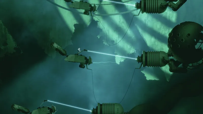The platforming feels great and deceptively precise despite how floaty the scientist feels, and tricky obstacles made every edge-of-my-seat jump feel achieved by the skin of my teeth. A special gadget that lets you switch places with certain objects is a simple mechanic used in increasingly clever ways, such as stacking boxes to reach high perches, using objects as protective cover, or creating a midair platform path. Each zone also presents a different platforming mechanic to keep the adventure fresh, such as lasers that bounce the scientist around like a pinball, a time-slowing power, or constantly shifting gravity. Each mechanical twist changes how you explore this strange world in cool and thoughtful ways.