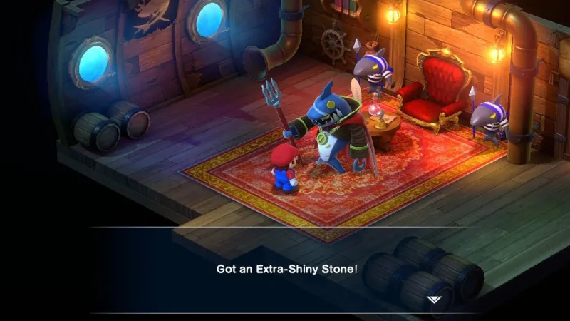 In the Sunken Ship, you need to head back to the Pirate Base to fight Johnny the shark in a one-on-one fight as Mario. I kept Bowser and Geno in my party to take advantage of their upgrades, but this fight really comes down to pulling off Action Commands almost exclusively. Defeating him gave me an Extra-Shiny Stone.