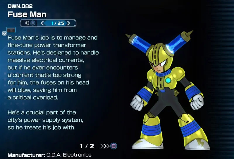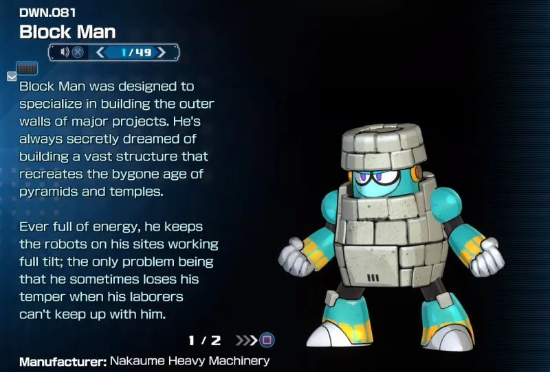 General tips: Halfway through this fight, Block Man takes on a new, gigantic form. When that happens, I suggest switching to the mega buster and just loading him up with charged shots using your power gear. Once you have the Chain Blast, jump over his final barrage and throw your bombs over his blocks.