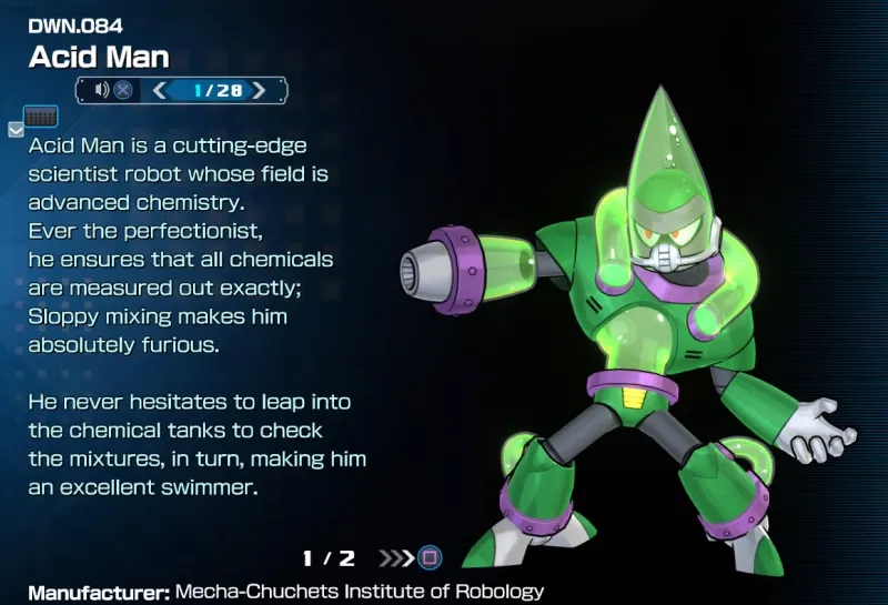 General tips: The Block Dropper will demolish Acid Man’s shield, so just keep dropping bricks. Make sure to slide past him when he jumps. Halfway through the battle he’ll send waves of acid at you, but those are easy to jump over if you watch for them.