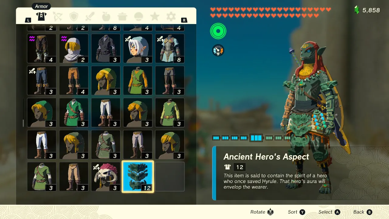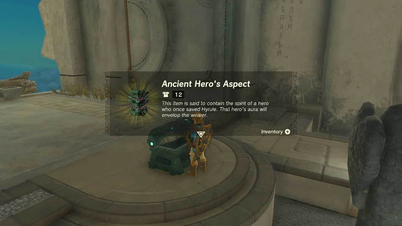 And in that chest is the Ancient Hero's Aspect. The armor is unlike any in Breath of the Wild or Tears of the Kingdom in that it is one piece and not treated as three separate items. It also completely alters Link's appearance. It is functionally like the masks of Majora's Mask that transform Link into a Zora, Goron, or Deku. Its description reads, "This item is said to contain the spirit of a hero who once saved Hyrule. That hero’s aura will envelop the wearer." It may be a representation of the very first incarnation of the Hero of Time.