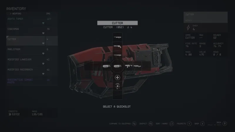 The d-pad on a controller gives you access to a number of quick-select options, but it's not immediately clear that you must select what you want to appear in those quick-select slots. Your best bet is to fill it with various types of weapons to handle every situation so you'll be able to quickly jump to a different gun if you run out of ammo. In the inventory menu while looking at a weapon, you must press the favorite button (Y on an Xbox controller) to place it in one of those slots.