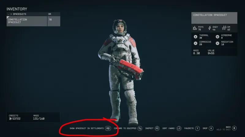 In Starfield, you need to wear your spacesuit on planets that don't play nice with human anatomy. You can put it on and off as needed, but the easiest way to deal with whether or not to have a spacesuit on is to secretly always be wearing one. The spacesuit inventory screen has an easy-to-miss option to make it so that your spacesuit disappears when you're in settlements with breathable air. The same option exists for the helmet, too, if you want to get more granular.