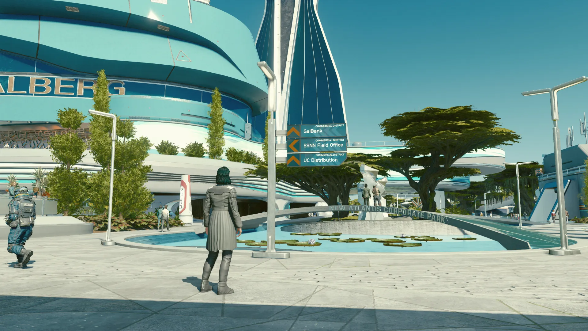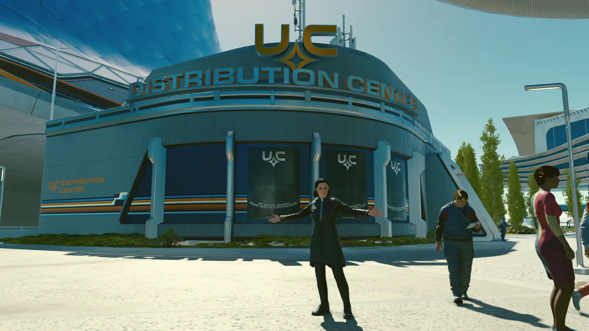 Even if you're following the tip below, it won't take long to be overburdened with stuff you want to sell. Nearly every merchant and store will buy items, but most are specialized in some way. The easiest place to sell a wide range stuff is at the Distribution Center, which looks like the building seen above. You should see street signs for it in New Atlantis.