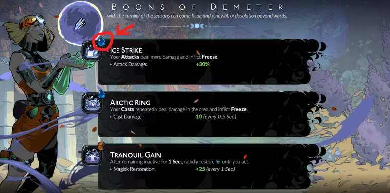 Olympian boons now have one of four elemental properties tied to them: fire, water, air, and earth. After unlocking Divination of the Elements, you’ll see small icons indicating each element on every boon you encounter. Demeter’s frost-based boons are generally (but not always) water types, while Hestia’s tend to be fire.