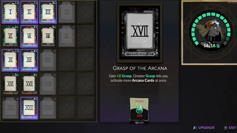 These are unlockable character perks found at the Altar of Ashes, located in The Crossroads. Fans can draw a similarity to the Mirror of Night from Hades 1. Examples of Arcana card effects include gaining two health points every time you exit a location or starting each run with 200 gold. Arcana cards require spending a certain amount of Ashes to obtain (and some require an additional resource). Cards consume portions of your Grasp.