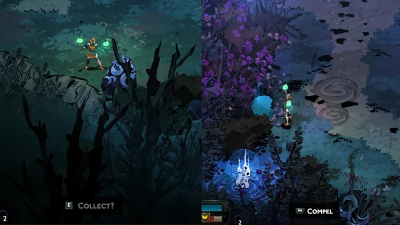 During runs, you’ll come across metal ores prompting you to mine. In the first area, Erebus, you’ll find piles of silver crescent moons, for example. Additionally, certain shades prompt you to “compel” them, and you’ll also encounter fishing holes.