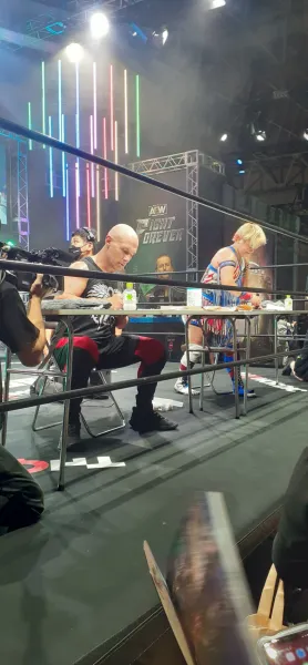 All Elite Wrestling's Christopher Daniels and Ryo Mizunami sign autographs for fans at the AEW: Fight Forever booth.