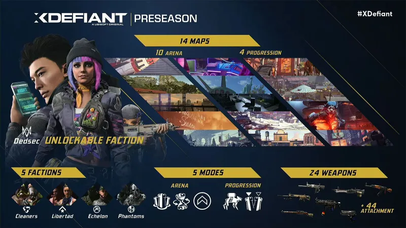 XDefiant will properly release this summer. The game is free-to-play, and while there's no release date yet, Ubisoft did give us a glimpse into what content will be available in the game's early days. Firstly, everything from the beta periods will be available at launch. This includes 14 maps, 5 modes, and 24 weapons. The game's five factions (Deadsec, Libertad, Phantoms, Echelon, and Cleaners) will be available, as well, though you'll have to unlock Deadsec through gameplay. We also got a quick look at some of the content coming in the game's first year. There will be 12 new weapons and 12 new maps, which is a pretty significant expansion on the game's existing content, but also four entirely new factions. The only clue to each new faction is a series of silhouettes and an XDefiant logo with a different design.
