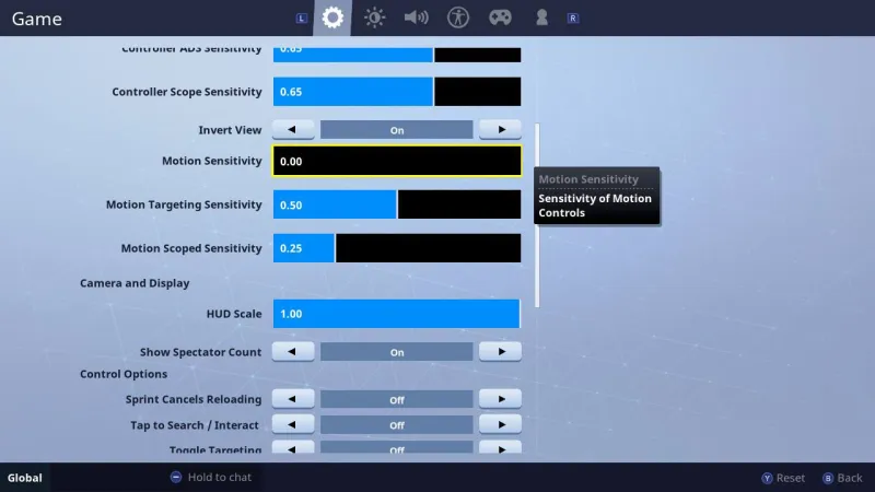 There are three motion control settings available on Switch: Motion Sensitivity, Motion Targeting Sensitivity, and Motion Scoped Sensitivity. Motion Sensitivity applies motion controls to everything. If you move the controller at any time, the camera corresponds, and when it is turned all the way up, it is incredibly erratic. The GIF below demonstrates what even some slight controller movement looks like with that setting pumped up to 1.0. I didn't move the controller too much, but when it is maxed out, the camera move very fast. My recommendation for this setting is to turn it down to zero.