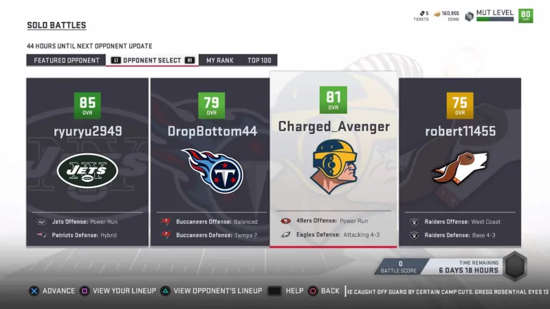 If you want a slightly different MUT experience and you have some friends who want to play, you can get together and play the MUT Squads co-op mode either versus the CPU or other teams of three players. Playing gets you rewards that you can turn in for various set prizes like players, coach Madden himself, classic unis, or the current ultimate prize of a 90 OVR David Johnson.