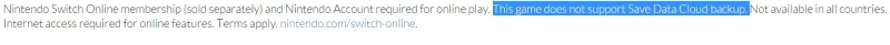 On the page for Pokémon Let's Go Eevee & Pikachu, a message at the bottom indicates that cloud saves are a no-go for the two Nintendo-published games. The warning reads "Nintendo Switch Online membership (sold separately) and Nintendo Account required for online play. This game does not support Save Data Cloud backup. Not available in all countries. Internet access required for online features." This warning is also on the page for Splatoon 2.