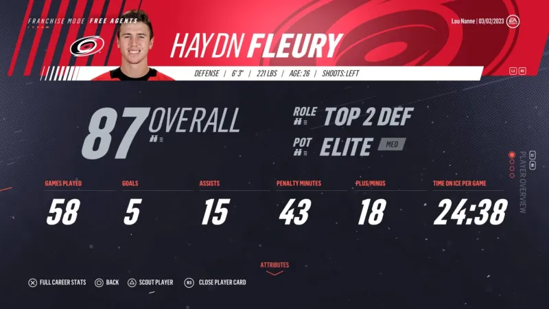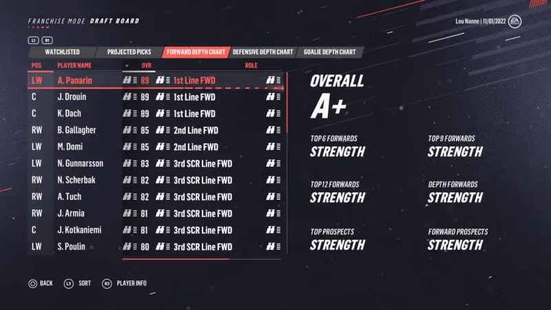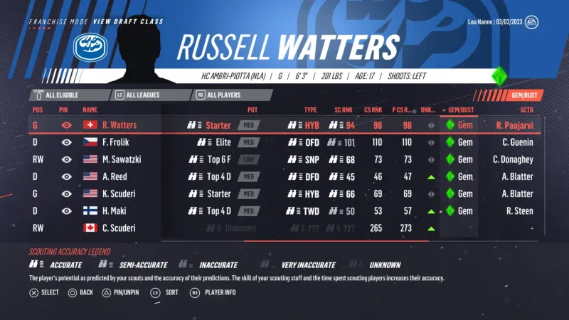 Before you jump into View Draft Class, analyze your organization’s prospect pool to figure out what your weaknesses are. Are you lacking grinders and two-way forwards in your bottom six? Do you have a dearth of offensive defensemen? Maybe you lack a pure sniper? Once you understand your organization needs, jump into the View Draft Class menu and seek these positions/archetypes out. You still want to draft the best players available in every round, but knowing when there are players who are good but also fit positions of need is a great tiebreaker when looking at two prospects with similar skill and potential. When you press R3 to see a player’s info that matches your weakness, you should see the button option for scouting the player. If you don’t, that means a scout is already assigned to check out the player.