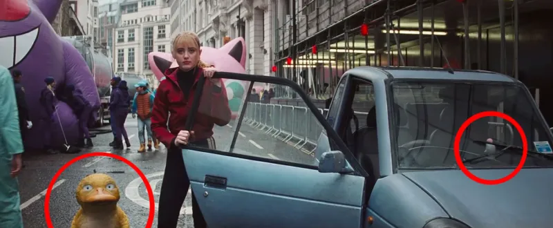 Psyduck can be seen here standing with Kathryn Newton's character. If the trailer is any indication, it looks like Psyduck is with her the whole movie. There is also a giant Gengar balloon float behind them. There is also a Spoink on the dashboard of the car. It's unclear if it's a real Spoink, or just a dashboard decoration.