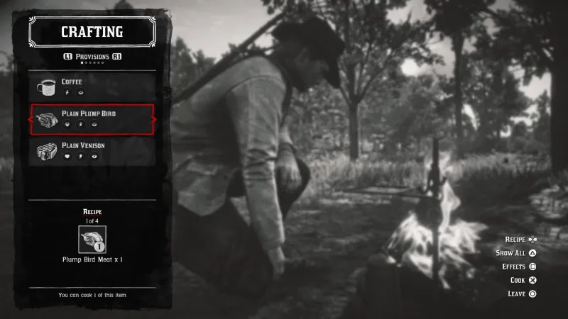 Thanksgiving isn’t called turkey day for nothing, and Red Dead Redemption II lets you celebrate the right way. Start your meal like the pilgrims, by shooting or running over a turkey. Once that’s done, all you need to do is rest at a campfire and roast up the main course in your feast. If you want to spice up your meal, there are mint, oregano, and thyme variations in the game.