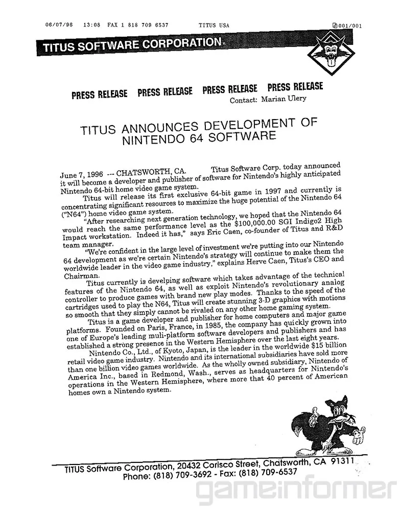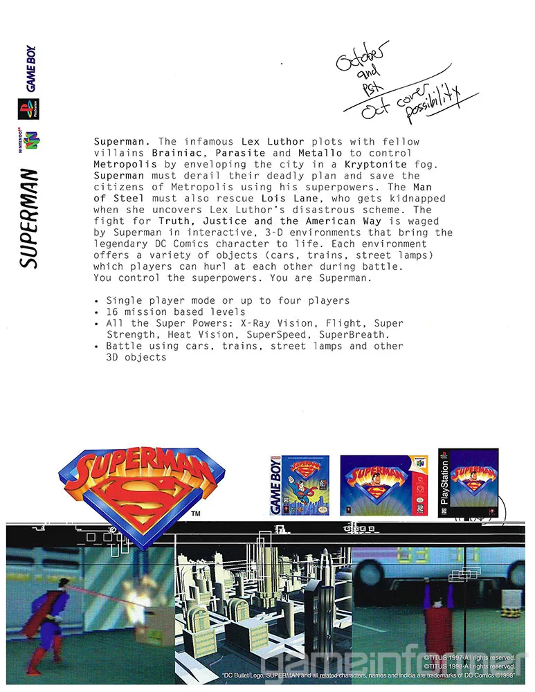 After thumbing through the team's file of developer/publisher Titus Interactive, we discovered multiple press releases, several pre-release renders and assets, and even a wireframe version of Lois Lane's character model. It even turns out the development team pitched it as a possible Game Informer cover, as is indicated by a scribble at the top of the page by one of the editors. On that same page, at the bottom, is an advertisement for the PlayStation Superman game that never released.