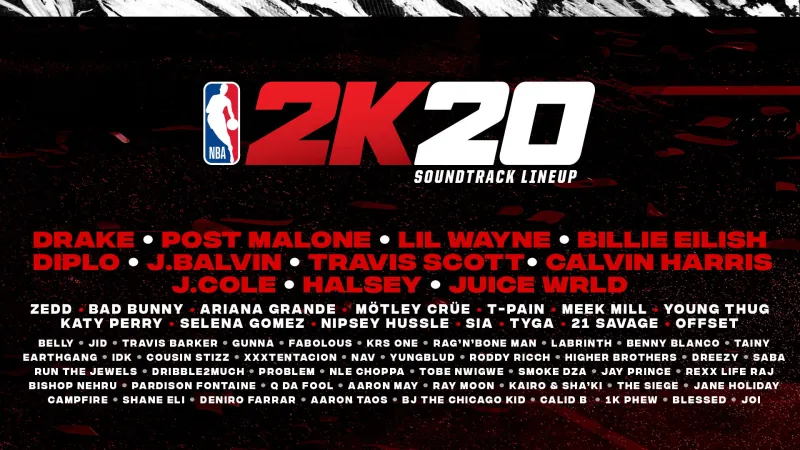 After revealing the cover althete and the player ratings, 2K is now ready to share more details about the music that will accompany you on and off the court in NBA 2K20. The 50-song soundtrack features popular artists, such as Drake, Billie Eilish, Post Malone, and Lil Wayne. You can see a full list on the image above, which showcases an eclectic mix of artists, from Katy Perry to Mötley Crüe.