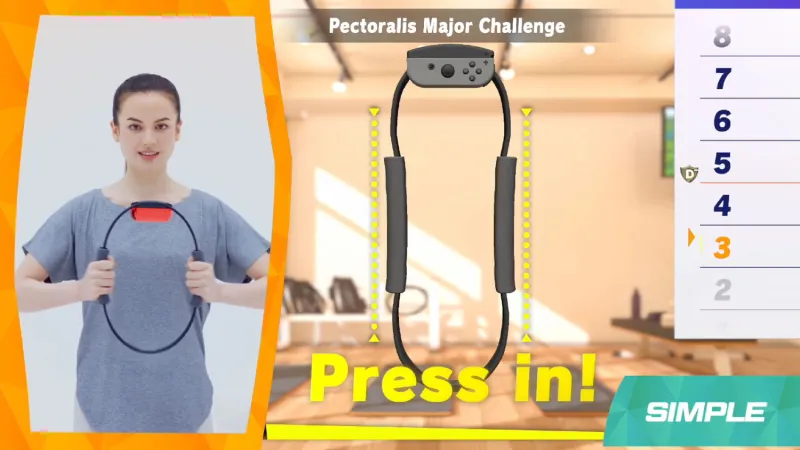 The Ring-Con peripheral offers adjustable levels of resistance to give players of various strength levels a challenge. Using the Ring-Con in conjunction with the leg strap, players can engage in 40 different activities, arranged in four different categories: arms, core, legs, and yoga-inspired moves.