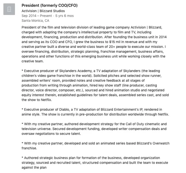 Nick van Dyk, the president of Activision Blizzard's film and television division, may have leaked the development of Overwatch and Diablo animated series on his LinkedIn profile, which GameSpot uncovered. According to his profile, the Diablo animated series is "rendered in anime style" and is in pre-production for Netflix. The Overwatch information isn't as detailed, and simply reads, "With my creative partner, developed and sold an animated series based on Blizzzard's Overwatch franchise." The buyer of the rights for this popular competitive shooter is not listed. You can see the profile listing below: