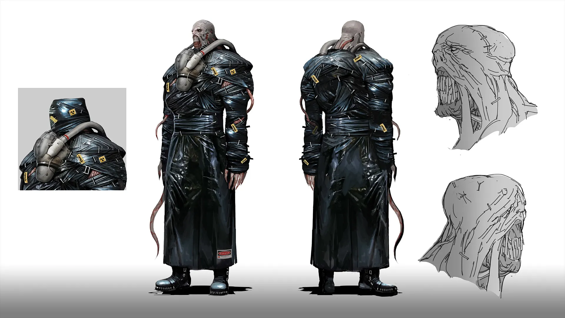 “It just felt like more of the same, so we went back to the drawing board,” Cho says. “The first thing I saw was the clothing. It felt strange to be creating a bioweapon and have it wear clothes. Rather than having him wear clothes, we had him wear something synonymous to a bodybag, something that made him feel like a restrained weapon. At the same time, I wanted to stay true to the original, so the silhouette of the Nemesis still has that iconic look.”