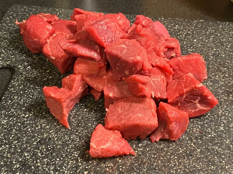 Take the trimmed beef cubes and throw them into a clean pan. Cook over medium heat until the sides are all browned. Remove from heat and set aside. You don't have to worry about the beef being too rare; you'll be simmering it in the curry for a long time before it's finished. You should be careful to not burn any sides, though. You'll want the beef pieces to be as tender as possible in the final dish.