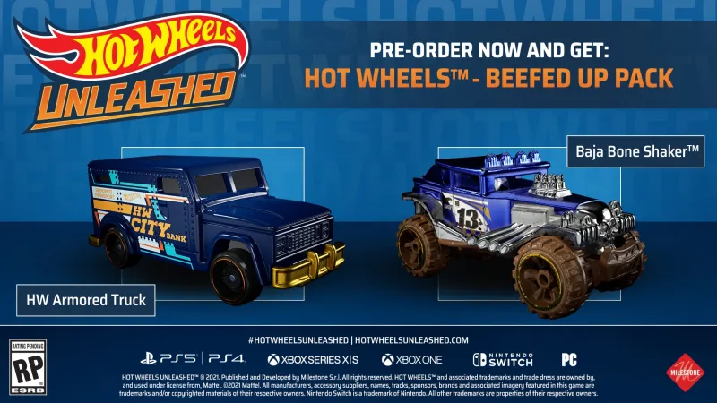 We still have much to learn about Hot Wheels Unleashed, but it launches September 30 for PlayStation 5, Xbox Series X, PlayStation 4, Xbox One, Switch, and PC. You can pre-order now to get the Beefed Up Pack, which includes the HW Armored Truck and Baja Bone Shaker, pictured below.