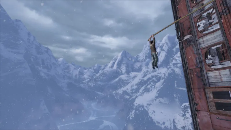 Nathan Drake is a magnet for trouble. He doesn’t just fall into bad situations; he falls into bad situations that unexpectedly get worse. So when he is in a train wreck in Uncharted 2, of course that wreck is going to send him dangling perilously over a freezing gorge. However, as precarious as position may be, you can’t deny that his snowy surroundings are gorgeous – and you can feel the relief when he reaches solid (if frigid) ground.