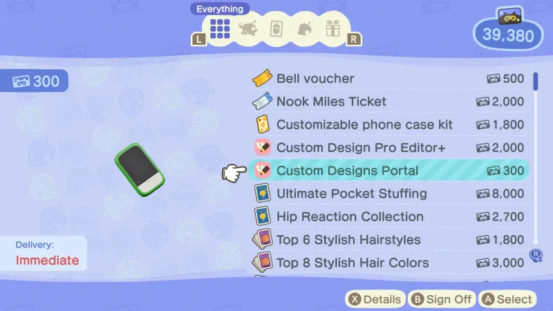 The Able Sisters store also has the Custom Design Portal, but you don't want to go there every time to use it. With the new update, now the NookPhone app has this design feature available right in that in-game cellular device. Look pretty; you deserve it.