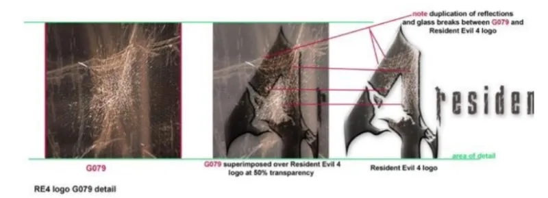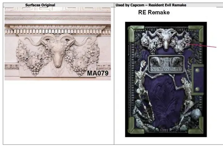 Via public court documentation, there are several images presented to show the references used from her book. The above image shows her photography on the left, with the Resident Evil Remake's depiction on the right. She also provided a comparison for the logo used in Resident Evil 4, as well: