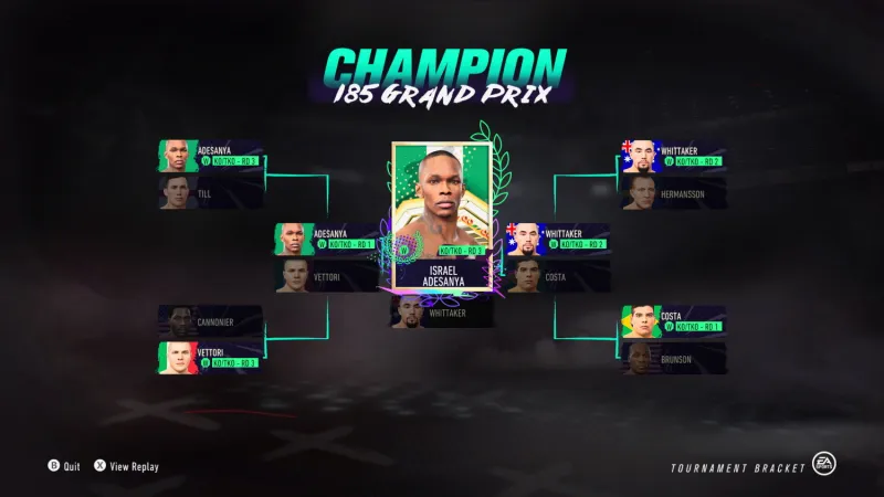 After a tiny scare in the first round against Darren Till, Adesanya cruised in his second rematch against Marvin Vettori, knocking him out in the first round, then taking on the man from whom he took the middleweight belt in the first place: Robert Whittaker. While Adesanya vs. Whittaker featured a ton of action and was fairly evenly matched, Adesanya once again finished Whittaker to confirm his coronation through this EA Sports UFC 4 tournament.