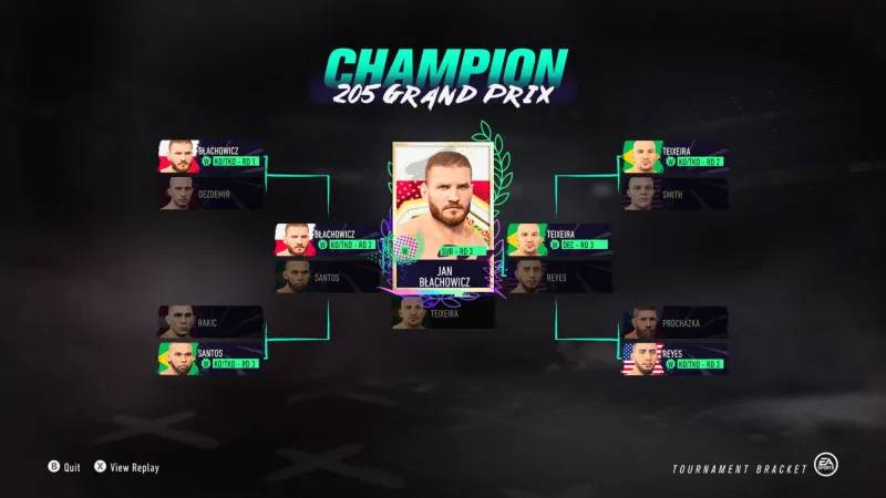 After Jon Jones left to go to heavyweight, the light heavyweight division became more interesting. Though Dominick Reyes felt like the uncrowned champ when he fought for the vacant title last year, Jan Błachowicz emerged with the belt. Though Błachowicz has been on an absolute tear, winning nine of his last ten fights, including a win over middleweight champ Israel Adesanya earlier this year, many are still waiting to see if he's the kind of fighter who can hold the belt for an extended period of time. According to EA Sports UFC 4, he very well might be. While it was surprising to see Reyes defeat Jiří Procházka in a rematch of their fight from earlier this year, the rest of the bracket played out realistically, with the two fighters in the championship fight – Błachowicz and Glover Teixeira – serving as the next real-life title fight in the division. If the real fight between those two is anything like EA Sports UFC 4's prediction, we're in for a treat when it occurs in October.