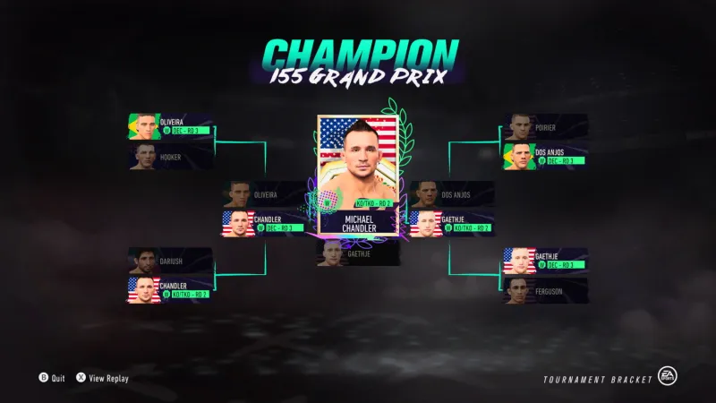 Though Oliveira was able to take care of business in the first round, the real-life champ lost his rematch against former Bellator champ and recent UFC convert Michael Chandler. That first fight, which took place at UFC 262 earlier this year, was a back-and-forth, Fight of the Year contender, so the change in the result isn't that surprising in this digital rematch. However, the biggest surprise came on the other side of the bracket when Rafael Dos Anjos won a close decision against Dustin Poirier. Dos Anjos is a former champion, but many consider Poirier the best fighter at 155. Still, the division is stacked; it's hard to argue against any results. The championship came down to Gaethje and Chandler, who delivered arguably the best fight of any tournament I simulated. This absurdly paced matchup didn't last long, but it was non-stop action until Chandler landed an uppercut from hell while Gaethje tried to land one of his own. Watching it play out in EA Sports UFC 4 made me all the more excited for the real-life match-up between these two, which is targeted for UFC 268 in November.
