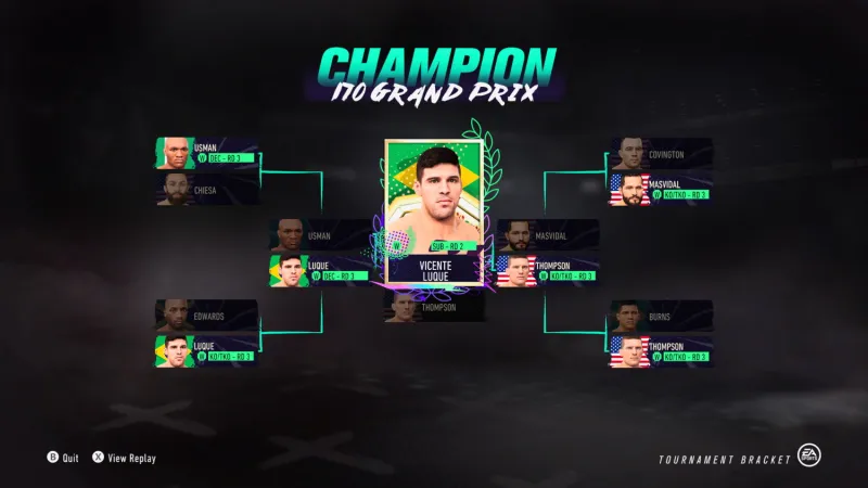 Using the current official UFC rankings found on the promotion's website, I constructed eight-person tournament brackets featuring the highest-ranked fighters of each weight class (aside from women's featherweight, since there are no official rankings and EA Sports UFC 4 only has two active fighters from that division). The seeding is based on current ranking, though for some high-profile fighters who are in the process of changing weight classes (like Jon Jones or Cody Garbrandt), I had to plug them in where it made the most sense. I then watched every fight as the A.I.-controlled combatants duked it out. Each fight was scheduled for three rounds, except for the championship fight at the end, which could go five rounds.