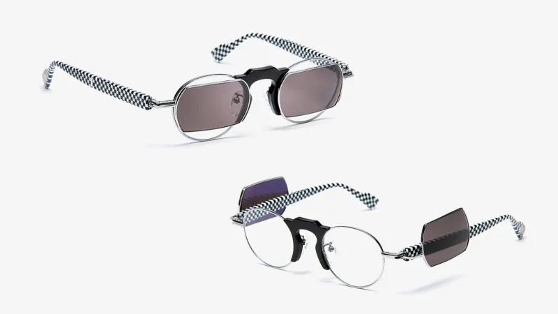 The HKxJF01 glasses feature two standard lenses and two transforming sunglass shades that can seemingly be placed in front of the glass lenses or pushed outwardly to sit beside each glass lens.