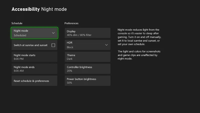 A customizable blue light filter has been added as well, and Xbox says this feature “does not impact performance, screenshots, or game clips.” You can schedule the console’s Night Mode to be activated whenever you want, and it can even be timed with your local sunrise and sunset times.