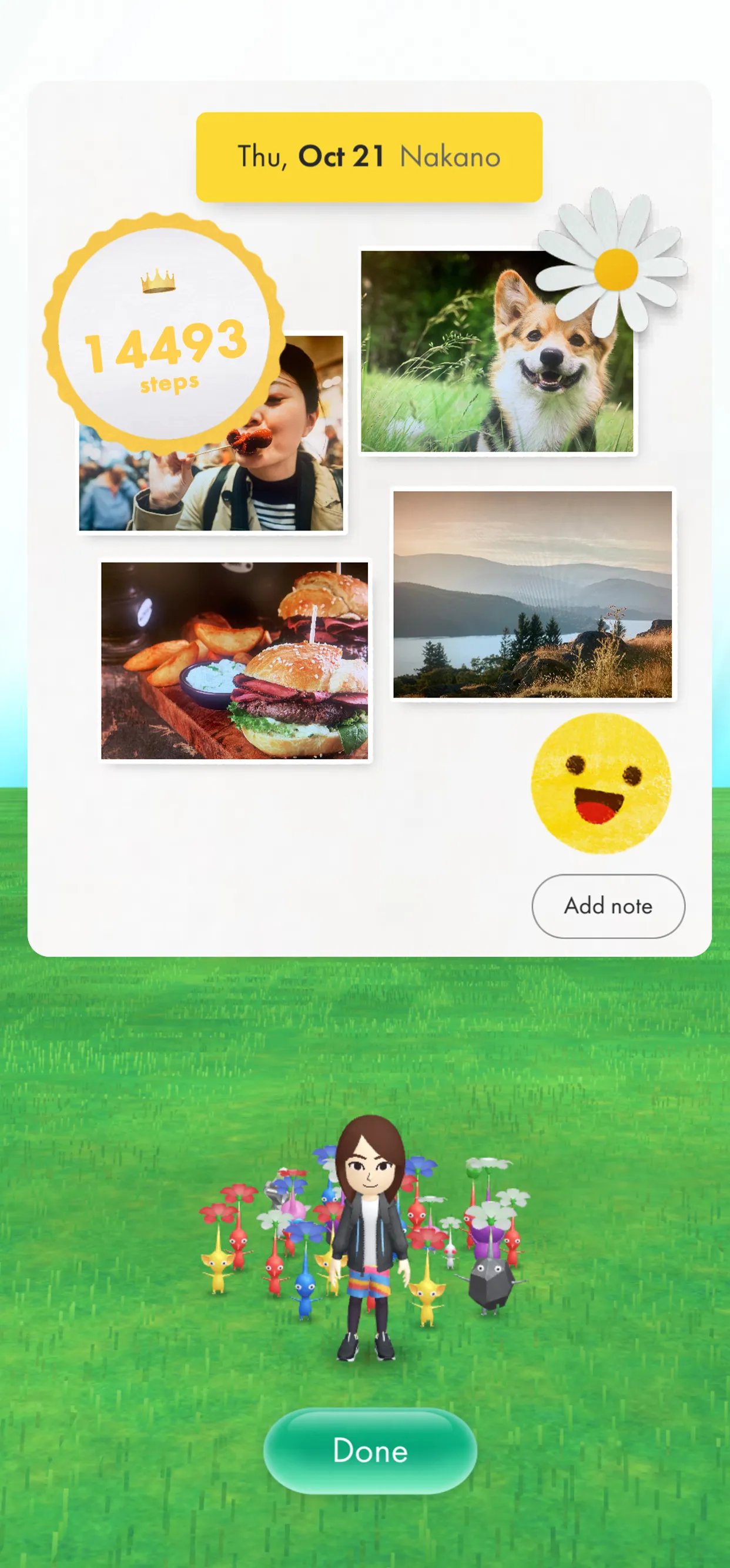 At the end of each day, the app will catalog your daily steps, award achievement badges for things like growing a set amount of Pikmin and give you the option to make a kind of memory log with notes and pictures. Your actions convert into points that help you level up; reaching higher levels grant perks like letting more Pikmin join your active walking squad, unlocking different colored creatures, or gaining a few useful items.