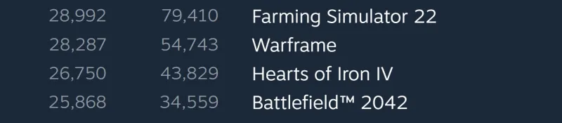 In the image above (captured from Steam's own data you can see here), the numbers on the left represent current active players for each game, while the numbers on the right are total players for the day. As of the time of this snapshot, Farming Simulator 22 had over 3,000 more current players than Battlefield 2042.
