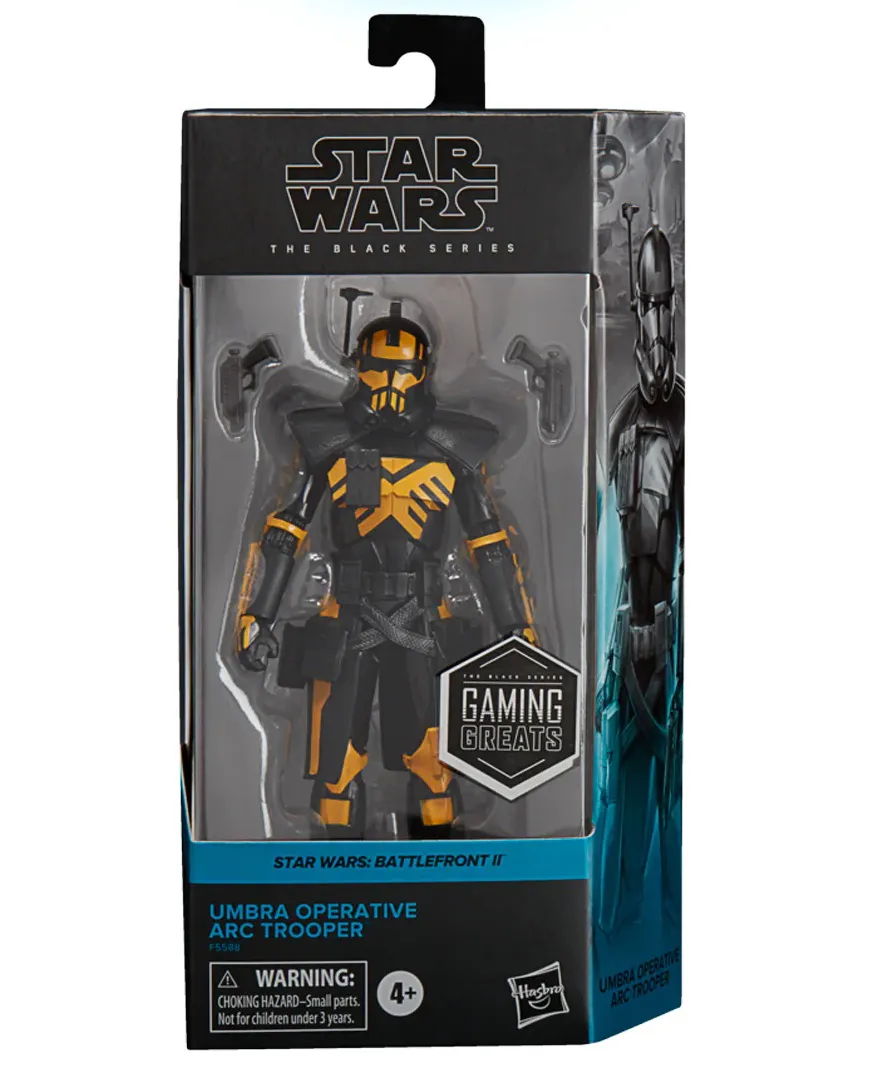 The latter figure is the Umbra Operative Arc Trooper with a cool black and orange coloring. This clone stands at roughly six inches in height and comes with two pistols. It will be sold exclusively at GameStop with an expected ship date next April.