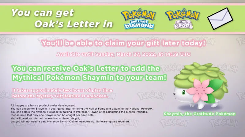 After receiving the Oak’s Letter Mystery Gift, you’ll be able to encounter Shaymin and catch the mythical Pokémon and add it to your team. As noted by the trailer, it takes approximately two hours of play time before the Mystery Gift feature is unlocked in new playthroughs of Brilliant Diamond and Shining Pearl.
