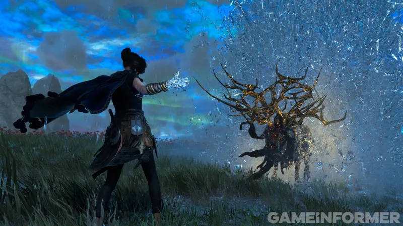 That includes warping the area’s native creatures into crazed beasts. Within moments of entering the realm, a pair of mutant bucks attack Frey. Their flesh looks like it was melted with molten gold, which leaves the animals gilded in an unnatural, web-like pattern. The metallic latticework weaves up past the creatures’ black, lifeless eyes and wraps around viciously pointed antlers. It’s these sharp weapons that we first see emerging out of the heavy fog as the deer ram into the game’s heroine. After a hard-won fight full of dramatic magical combat, Frey continues moving into the murky new land. Eventually, the Break begins to lighten, revealing Avoalet’s striking scenery.