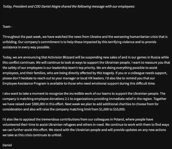 The publisher, by way of President and COO Daniel Alegre, announced this to employees via its own internal messaging system before publishing the statement on its own website on March 5. In the statement, Alegre revealed the suspension of sales in Russia and said its priority remains the safety ot its employees, especially those currently affected by what's going on in Ukraine.