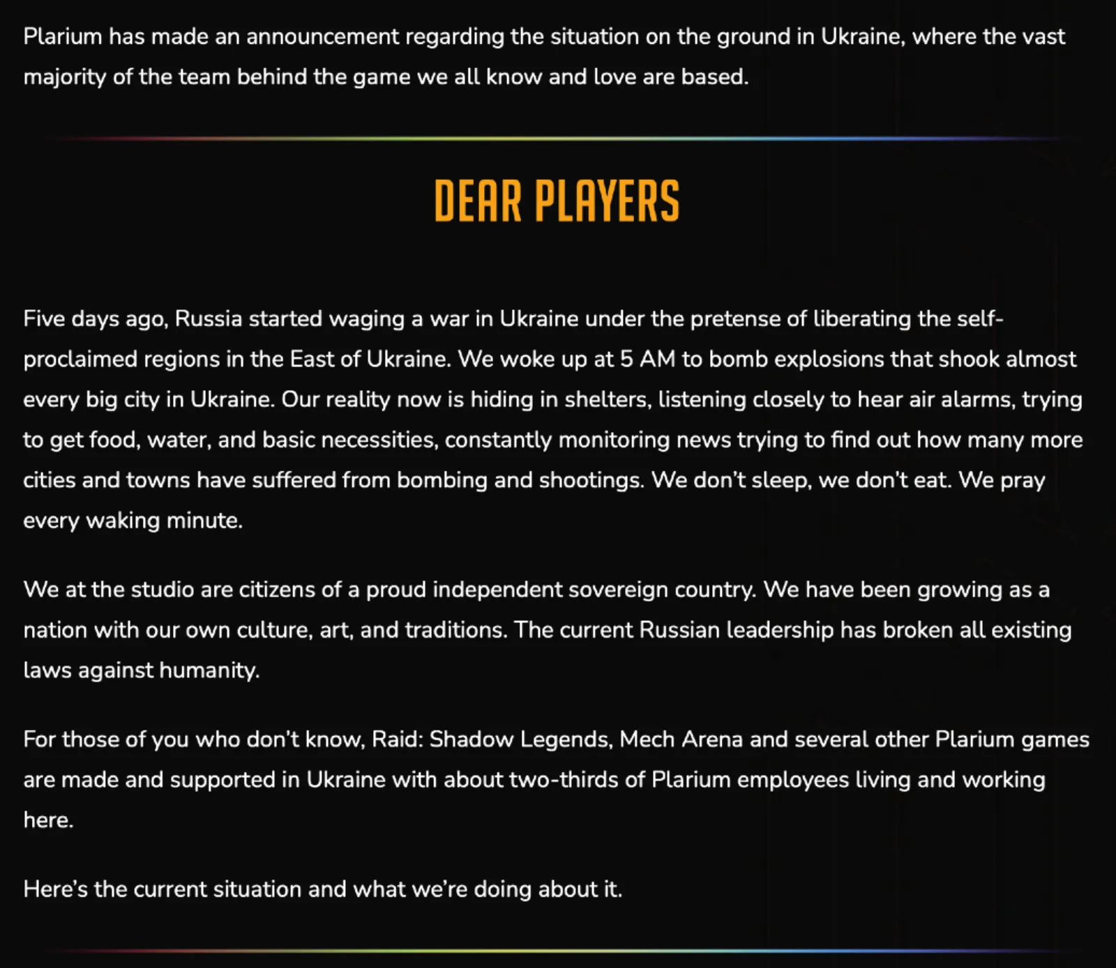 Original Story: Raid Shadow Legends developer, Plarium, which is based in Ukraine, announced on March 1 in a new blog post that it has more than 700 employees sheltering in place throughout Ukraine and that its priority is the safety of its team. Plarium also revealed that it has donated $500,000 to the Ukrainian Red Cross Society alongside links and instructional help for people who want to help and get involved. You can read the statements, in full, by paging through the gallery below: