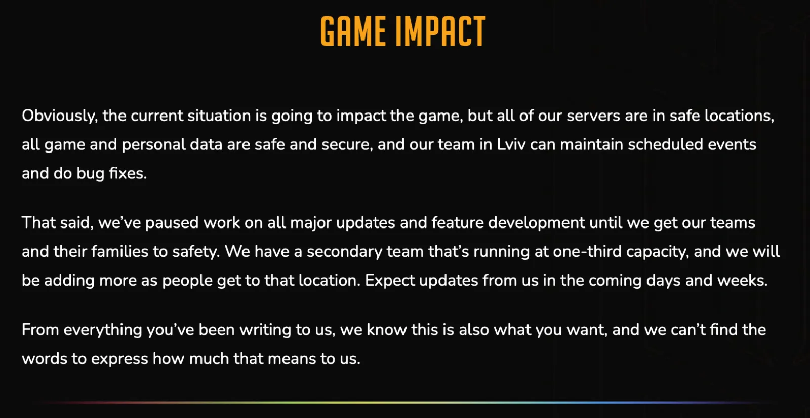 "We stand with the global community in hoping for peace and a rapid resolution to the violence and suffering in Ukraine. Niantic's games are no longer available for download in Russia and Belarus, and gameplay will also be suspended there shortly."