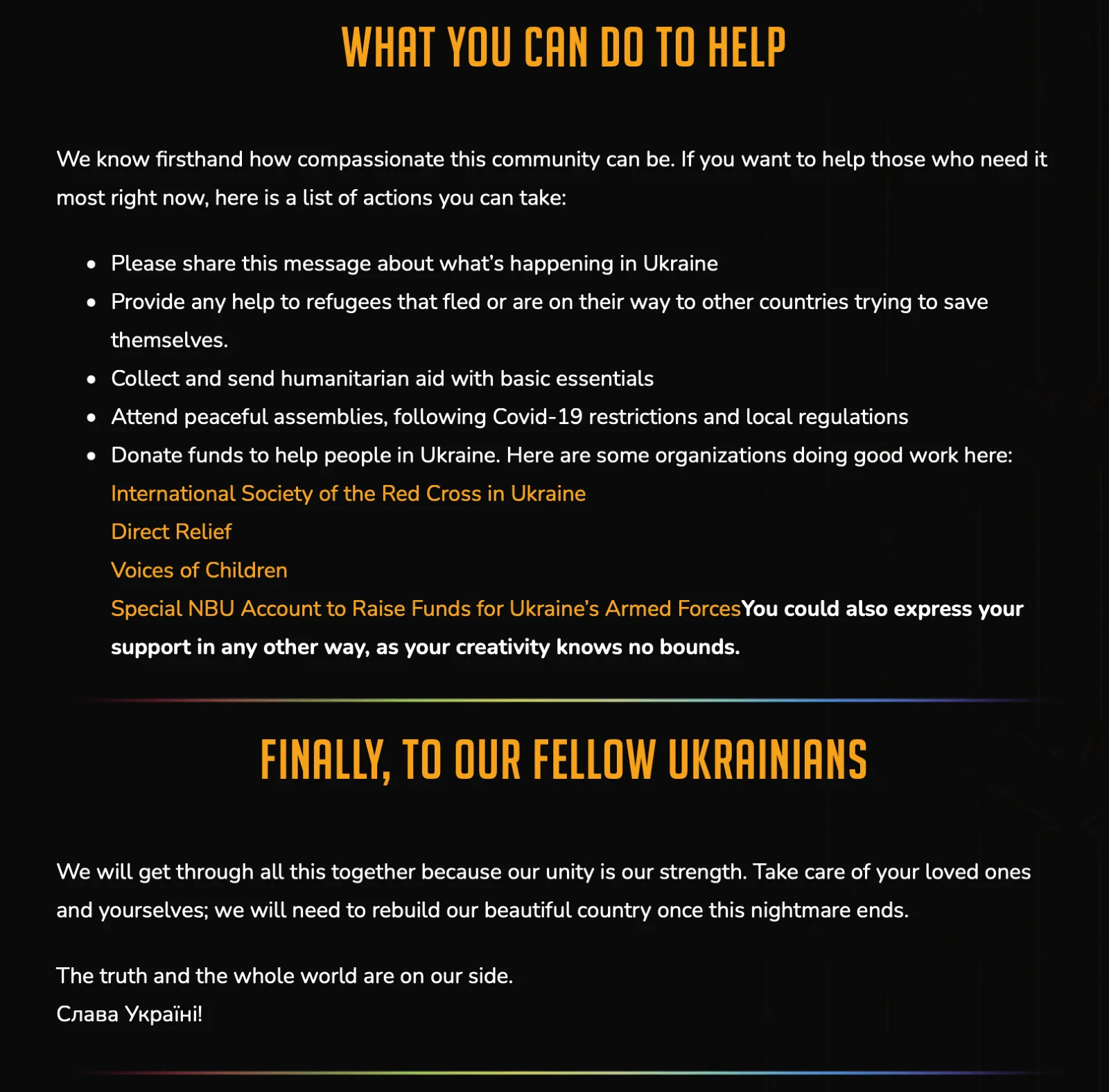 “Unity stands with the people of Ukraine,” Unity writes on Twitter. “Here’s how we’re helping to support those affected: Internally, our employees are directly supporting four international humanitarian charities focused on helping the people of Ukraine with a triple-matching commitment from the company and our leaders. As of March 1, Unity and our employees have committed over $623,000 to supporting Ukraine.”