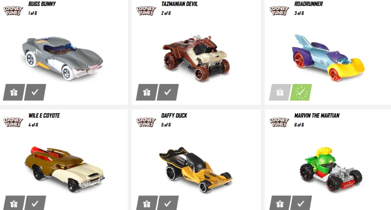 Hot Wheels released a set of six physical Looney Tunes cars in 2017, with the two vehicles shown in the trailer among the group. The others not announced from that set include Bugs Bunny, Taz the Tazmanian Devil, Marvin the Martian, and Daffy Duck. If I were a betting man, I'd assume the other three cars will come from these remaining four collectibles as well.